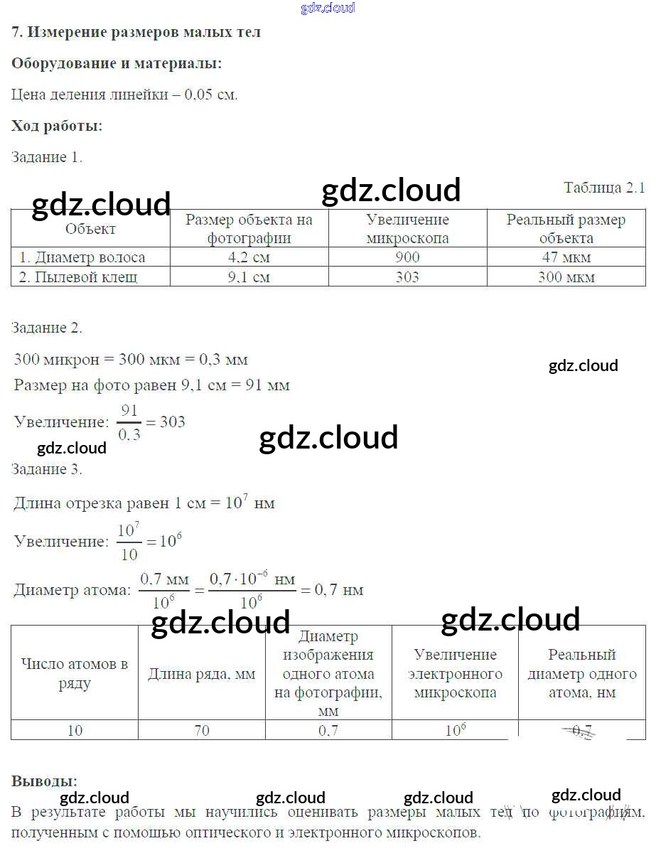 Ответ на задание №7. Измерение размеров малых тел Тетрадь-практикум Физика за 7 (седьмой) класс Белага, Воронцова, Жумаев, Ломаченков, Панебратцев Сферы 2012