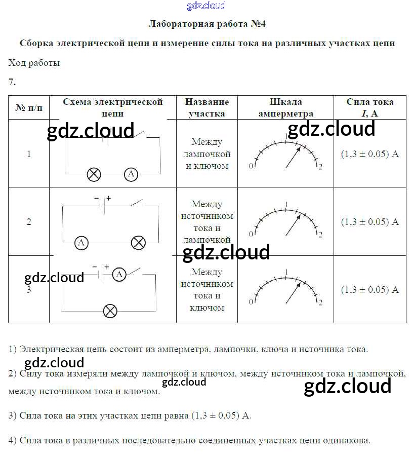 Ответ на задание ЛР №4. Сборка электрической цепи и измерение силы тока на различных участках цепи Учебник Физика за 8 (восьмой) класс Громов, Родина, Белага 2018
