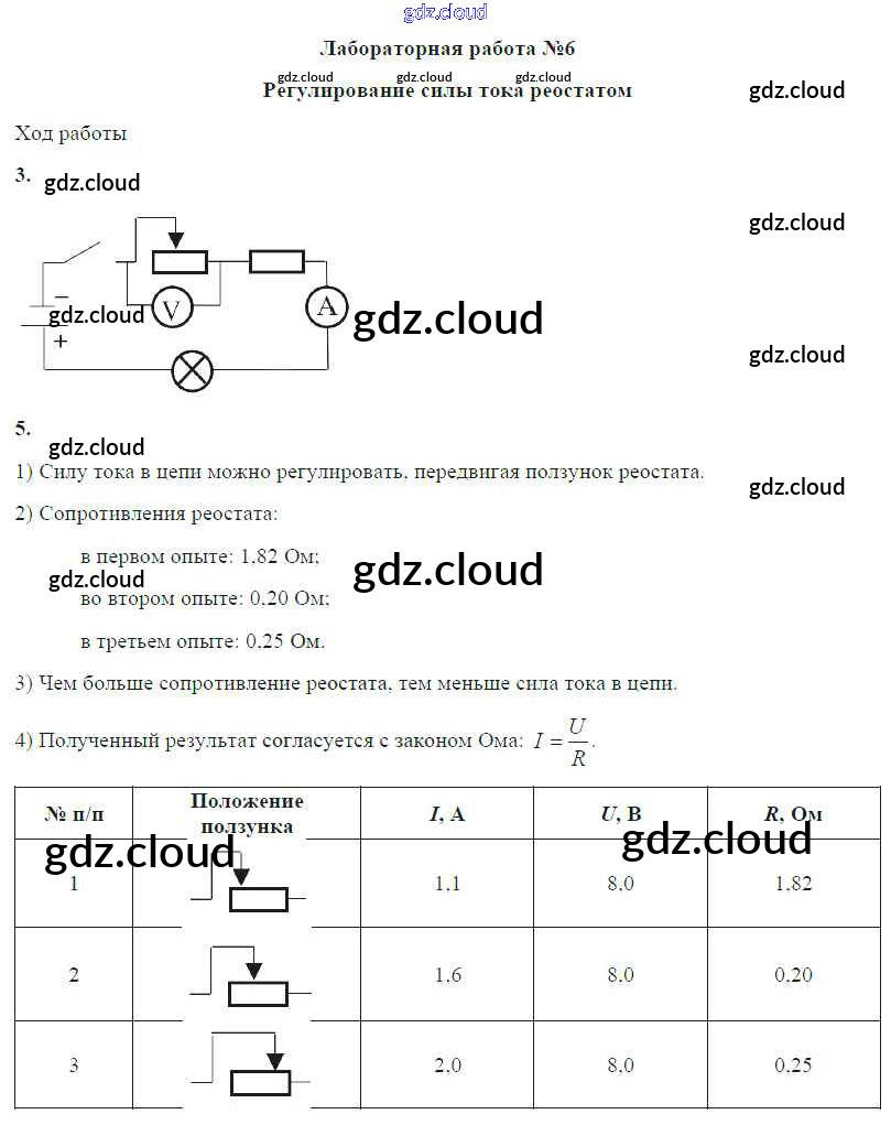 Ответ на задание ЛР №6. Регулирование силы тока реостатом Учебник Физика за 8 (восьмой) класс Громов, Родина, Белага 2018