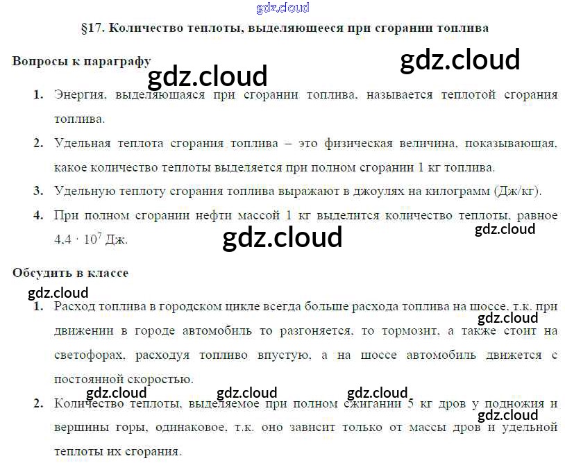 Ответ на задание § 17. Количество теплоты, выделяющееся при сгорании топлива Учебник Физика за 8 (восьмой) класс Громов, Родина, Белага 2018