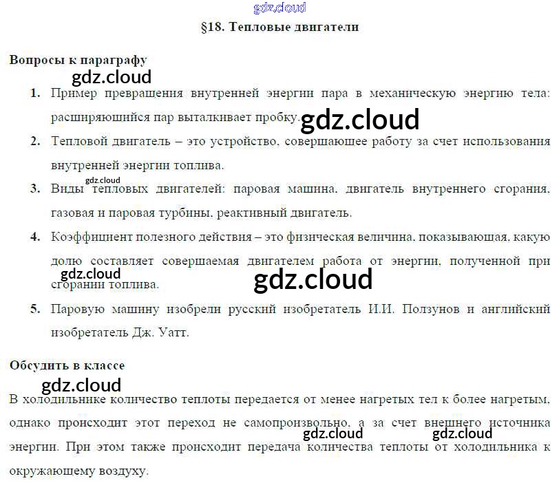 Ответ на задание § 18. Тепловые двигатели Учебник Физика за 8 (восьмой) класс Громов, Родина, Белага 2018 ФГОС онлайн и без номера телефона.