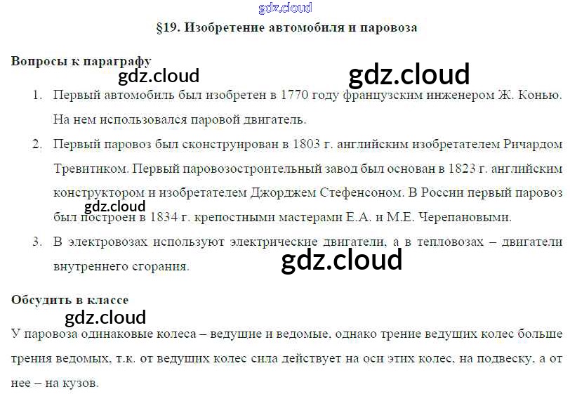 Ответ на задание § 19. Изобретение автомобиля и паровоза Учебник Физика за 8 (восьмой) класс Громов, Родина, Белага 2018 ФГОС онлайн и без номера телефона.
