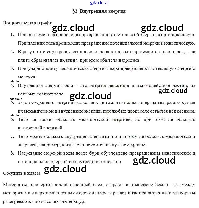 Ответ на задание § 2. Внутренняя энергия Учебник Физика за 8 (восьмой) класс Громов, Родина, Белага 2018 ФГОС онлайн и без номера телефона.