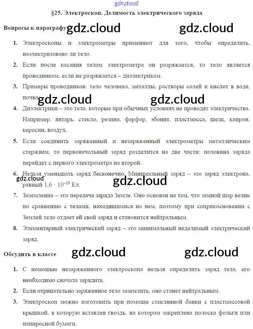 Ответ на задание § 25. Электроскоп. Делимость электрического заряда Учебник Физика за 8 (восьмой) класс Громов, Родина, Белага 2018
