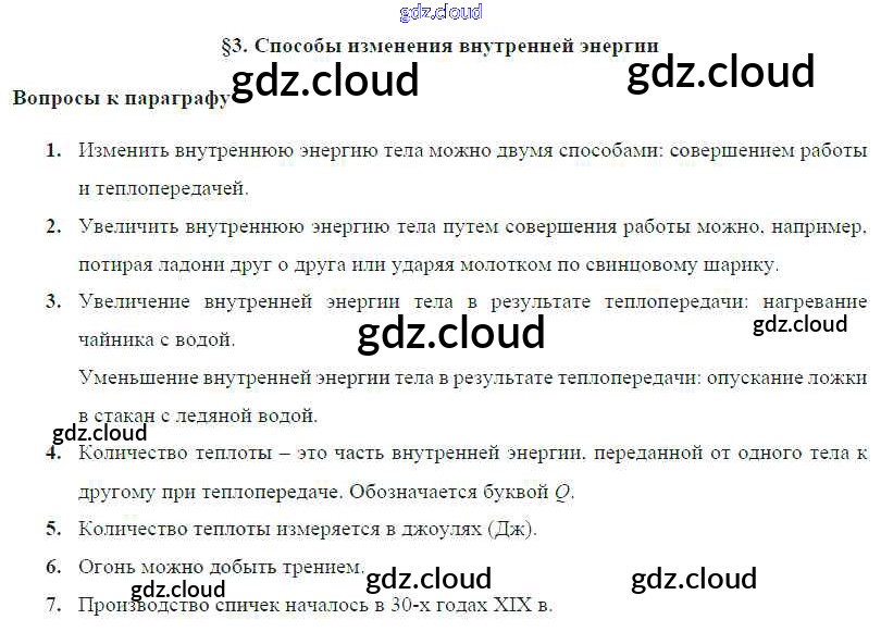 Ответ на задание § 3. Способы изменения внутренней энергии Учебник Физика за 8 (восьмой) класс Громов, Родина, Белага 2018 ФГОС онлайн и без номера телефона.