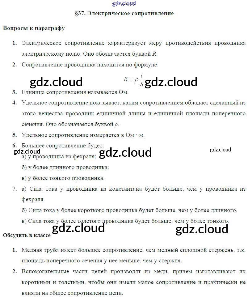 Ответ на задание § 37. Электрическое сопротивление Учебник Физика за 8 (восьмой) класс Громов, Родина, Белага 2018 ФГОС онлайн и без номера телефона.