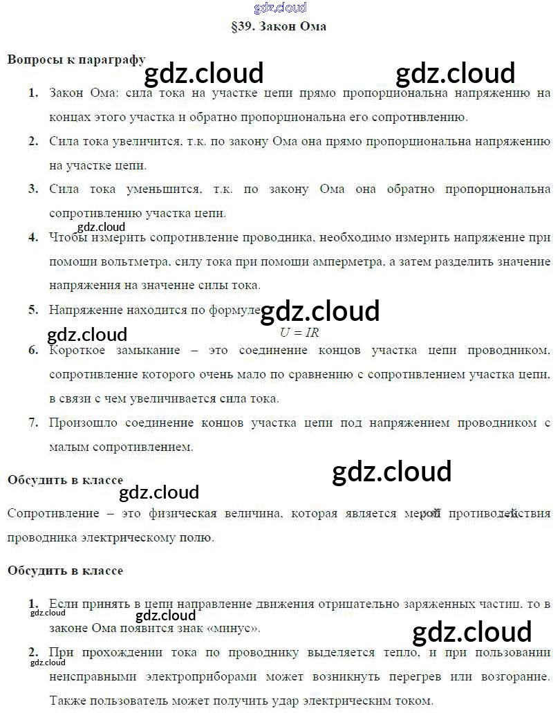 Ответ на задание § 39. Закон Ома Учебник Физика за 8 (восьмой) класс Громов, Родина, Белага 2018 ФГОС онлайн и без номера телефона.