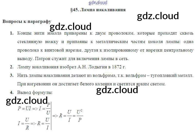 Ответ на задание § 45. Лампа накаливания Учебник Физика за 8 (восьмой) класс Громов, Родина, Белага 2018 ФГОС онлайн и без номера телефона.
