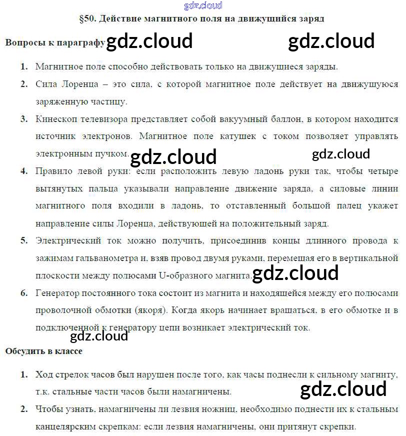 Ответ на задание § 50. Действие магнитного поля на движущийся заряд Учебник Физика за 8 (восьмой) класс Громов, Родина, Белага 2018