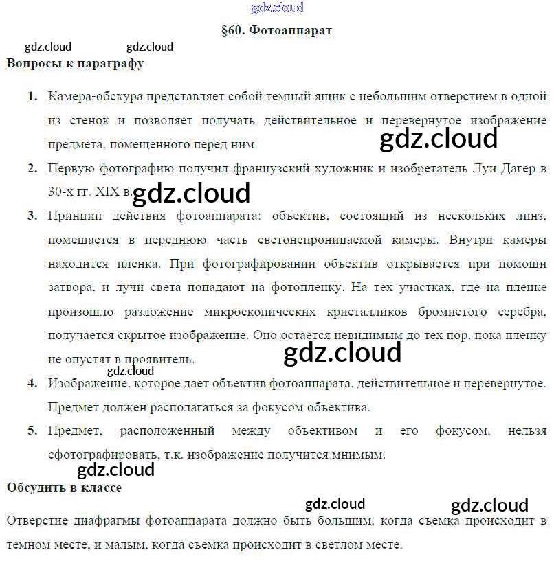 Ответ на задание § 60. Фотоаппарат Учебник Физика за 8 (восьмой) класс Громов, Родина, Белага 2018 ФГОС онлайн и без номера телефона.