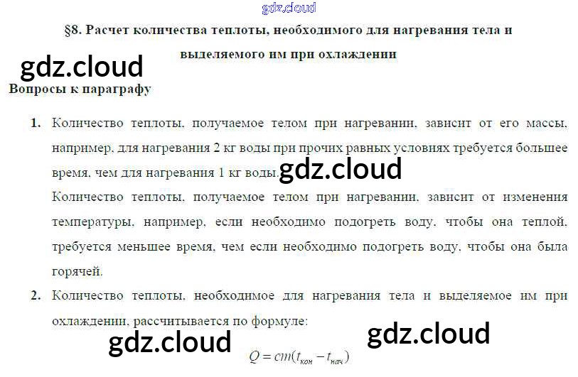 Ответ на задание § 8. Расчет количества теплоты, необходимого для нагревания тела и выделяемого им при охлаждении Учебник Физика за 8 (восьмой) класс Громов, Родина, Белага 2018