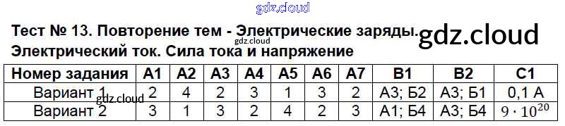 Ответ на задание Тест-13. Повторение тем - Электрические заряды. Электрический ток. Сила тока и напряжение Контрольно-измерительные материалы (КИМ) Физика за 8 (восьмой) класс Бобошина 2014