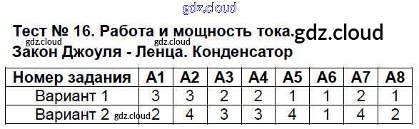 Ответ на задание Тест-16. Работа и мощность тока. Закон Джоуля - Ленца. Конденсатор Контрольно-измерительные материалы (КИМ) Физика за 8 (восьмой) класс Бобошина 2014