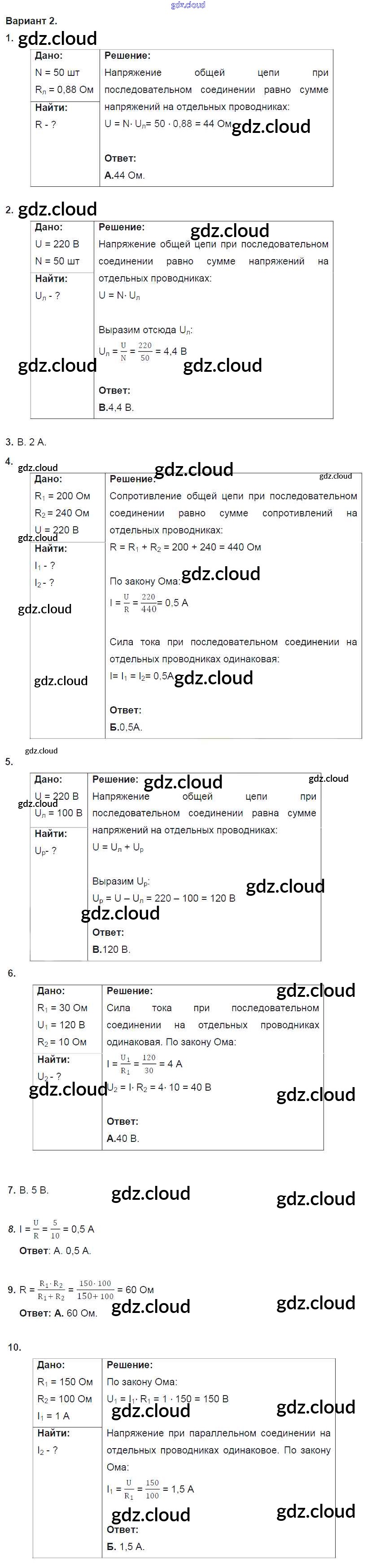 Тест №7. Соединение проводников. Варианты Ответы к тестам для самоконтроля по Физике 8 класс Дидактические материалы Марон Вертикаль Дрофа