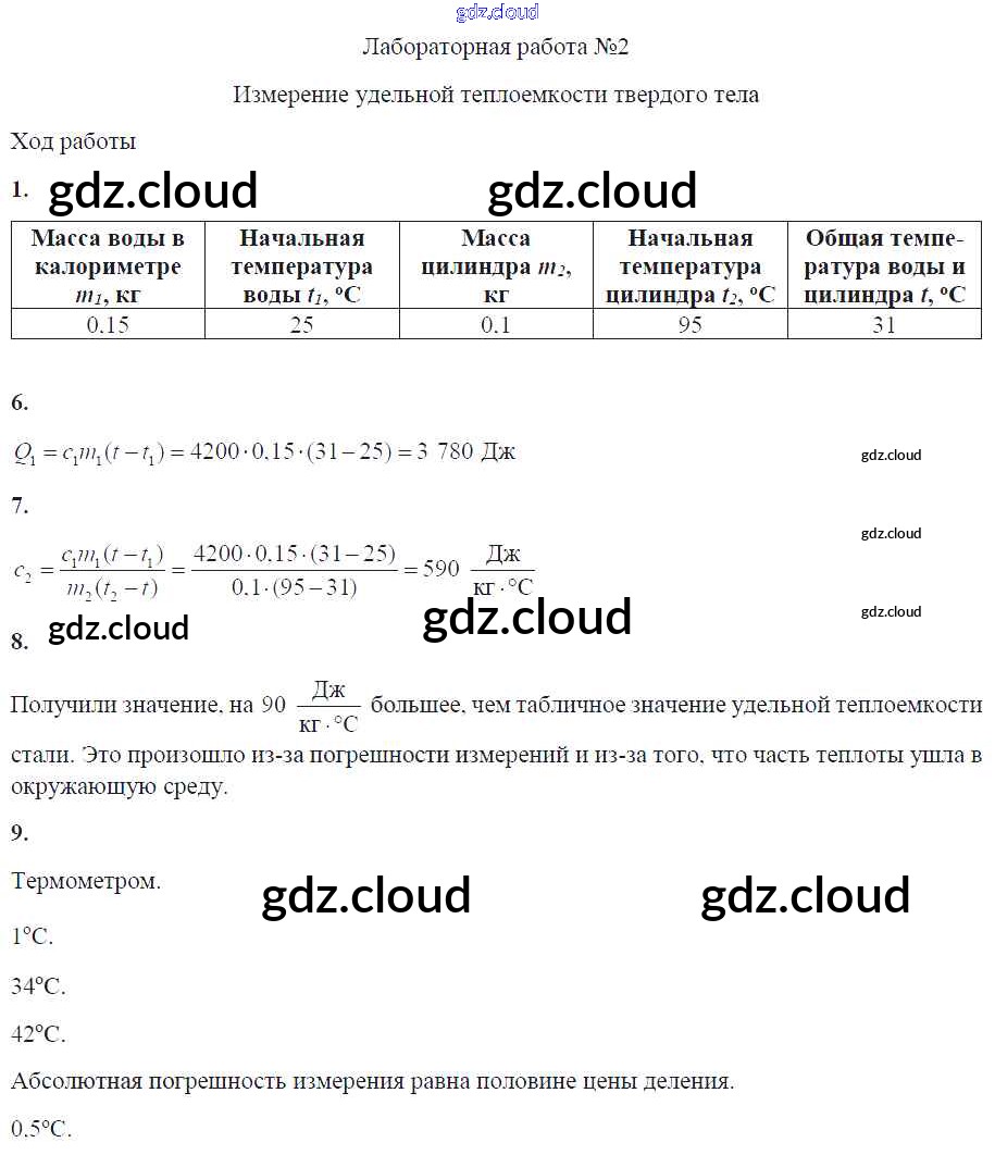 Ответ на задание ЛР №2. Измерение удельной теплоемкости твердого тела Тетрадь для лабораторных работ Физика за 8 (восьмой) класс Минькова, Иванова УМК 2014