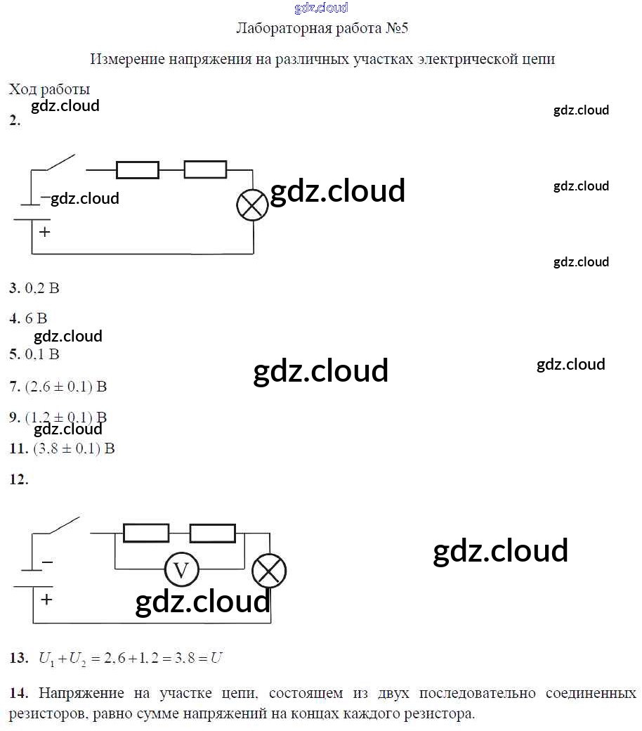 Ответ на задание ЛР №5. Измерение напряжения на различных участках электрической цепи Тетрадь для лабораторных работ Физика за 8 (восьмой) класс Минькова, Иванова УМК 2014