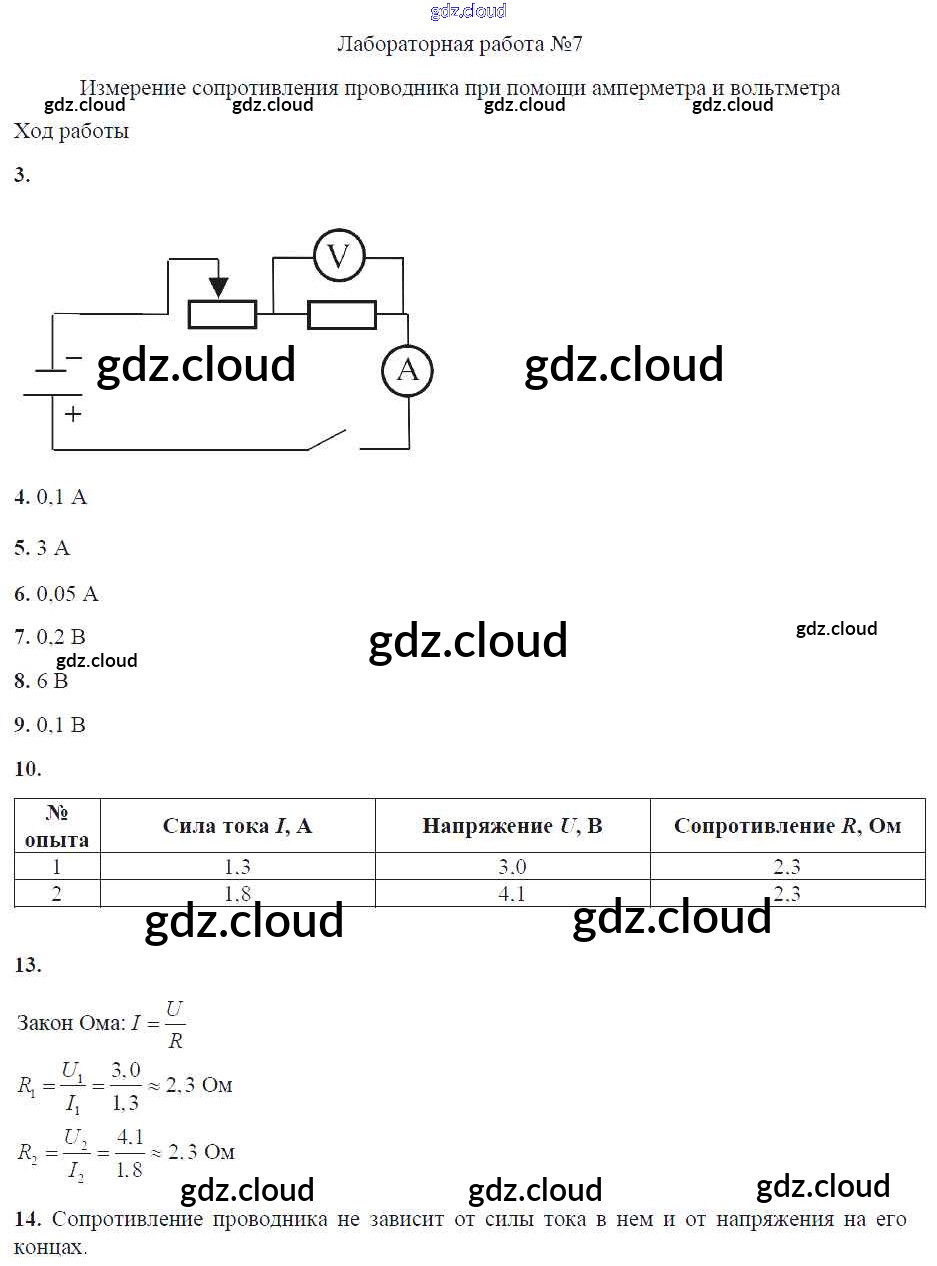 Ответ на задание ЛР №7. Измерение сопротивления проводника при помощи амперметра и вольтметра Тетрадь для лабораторных работ Физика за 8 (восьмой) класс Минькова, Иванова УМК 2014