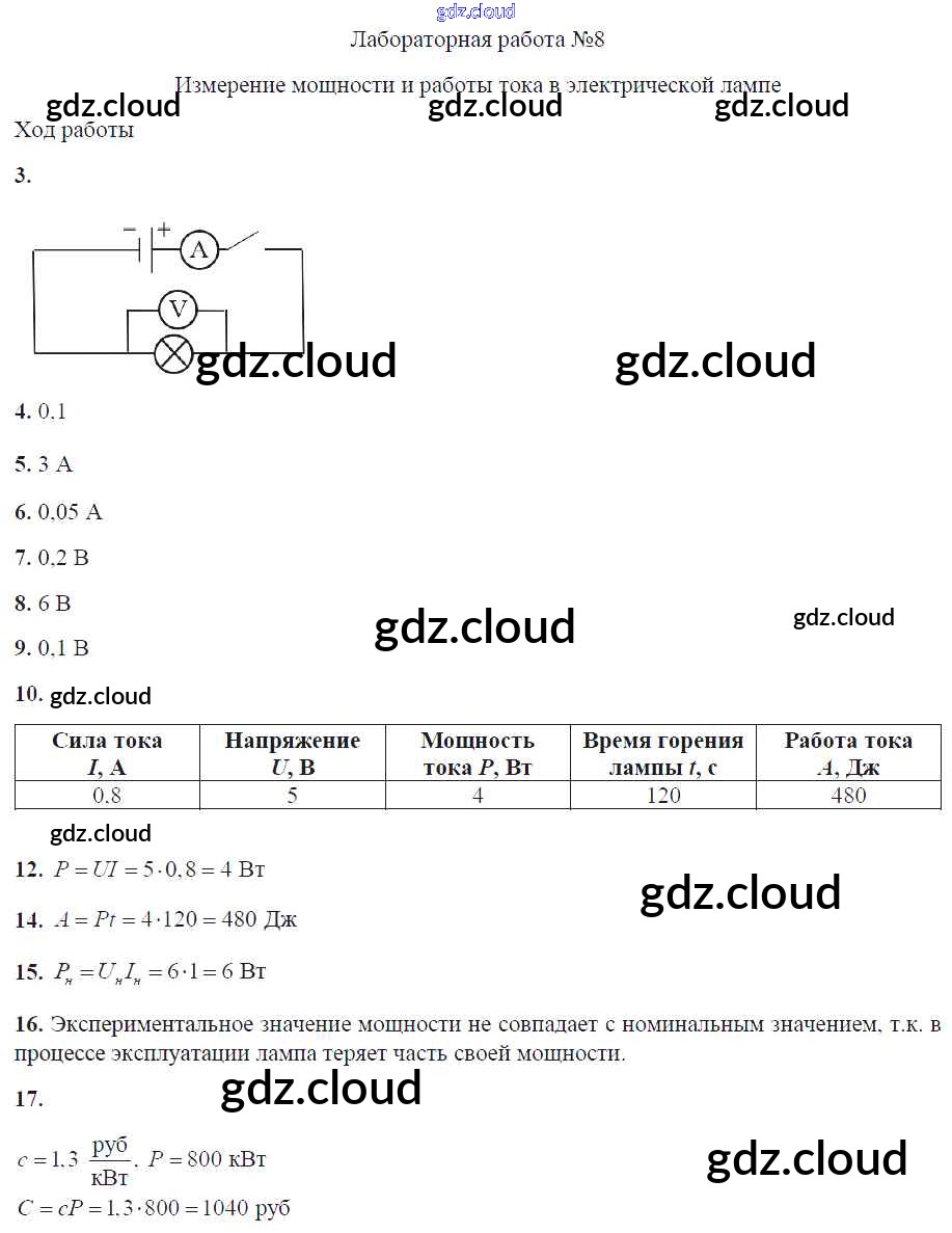 Ответ на задание ЛР №8. Измерение мощности и работы тока в электрической лампе Тетрадь для лабораторных работ Физика за 8 (восьмой) класс Минькова, Иванова УМК 2014