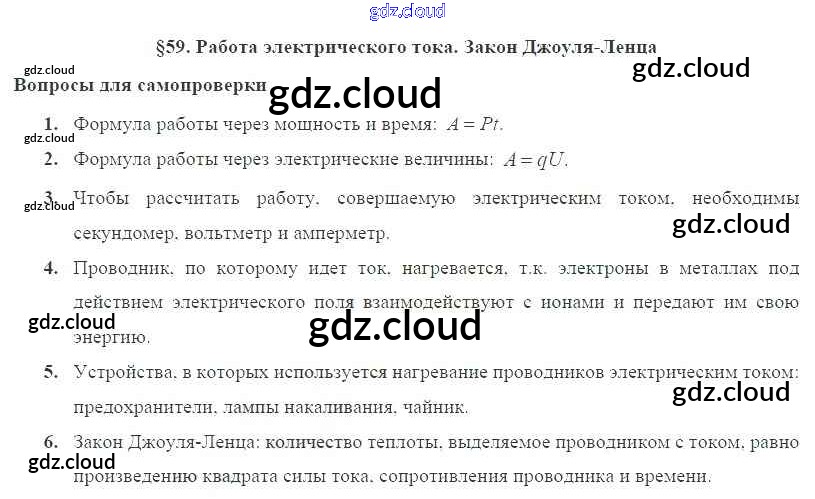 Ответ на задание § 59. Работа электрического тока. Закон Джоуля-Ленца Учебник Физика за 8 (восьмой) класс Пурышева, Важеевская Вертикаль 2017