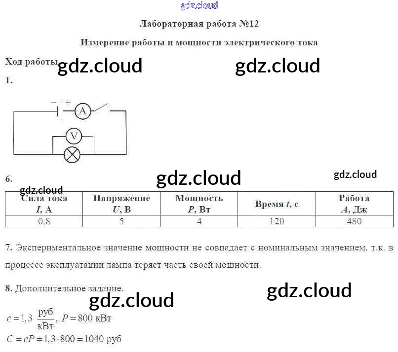 Ответ на задание ЛР №12. Измерение работы и мощности электрического тока Учебник Физика за 8 (восьмой) класс Пурышева, Важеевская Вертикаль 2017