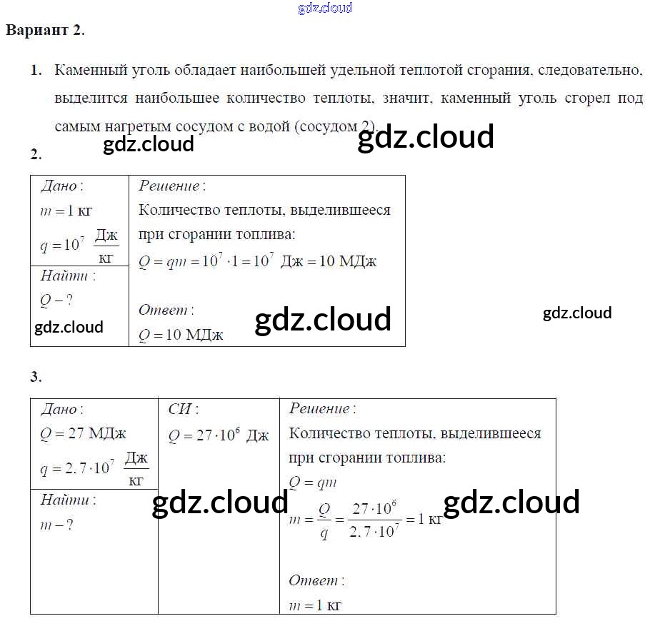 Ответ на задание Вариант-2 Самостоятельные и контрольные работы Физика за 8 (восьмой) класс Марон Вертикаль 2017