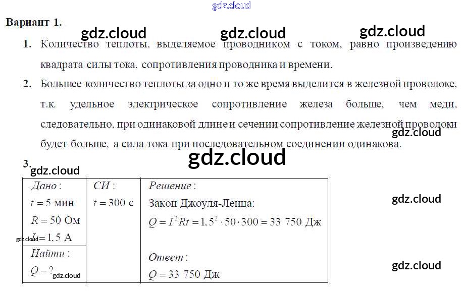 Ответ на задание Вариант-1 Самостоятельные и контрольные работы Физика за 8 (восьмой) класс Марон Вертикаль 2017