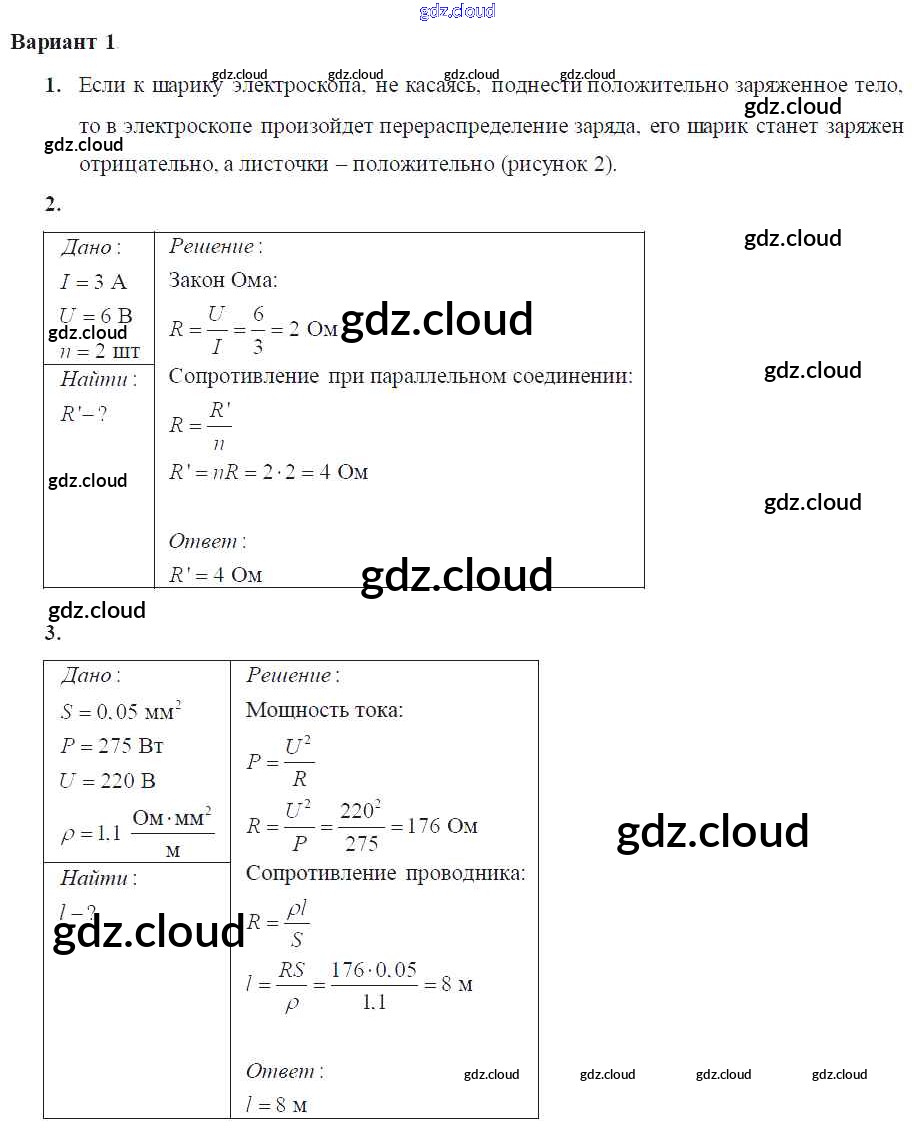Ответ на задание Вариант-1 Самостоятельные и контрольные работы Физика за 8 (восьмой) класс Марон Вертикаль 2017