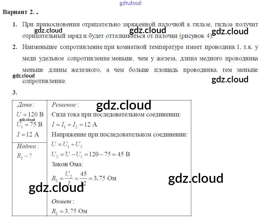 Ответ на задание Вариант-2 Самостоятельные и контрольные работы Физика за 8 (восьмой) класс Марон Вертикаль 2017