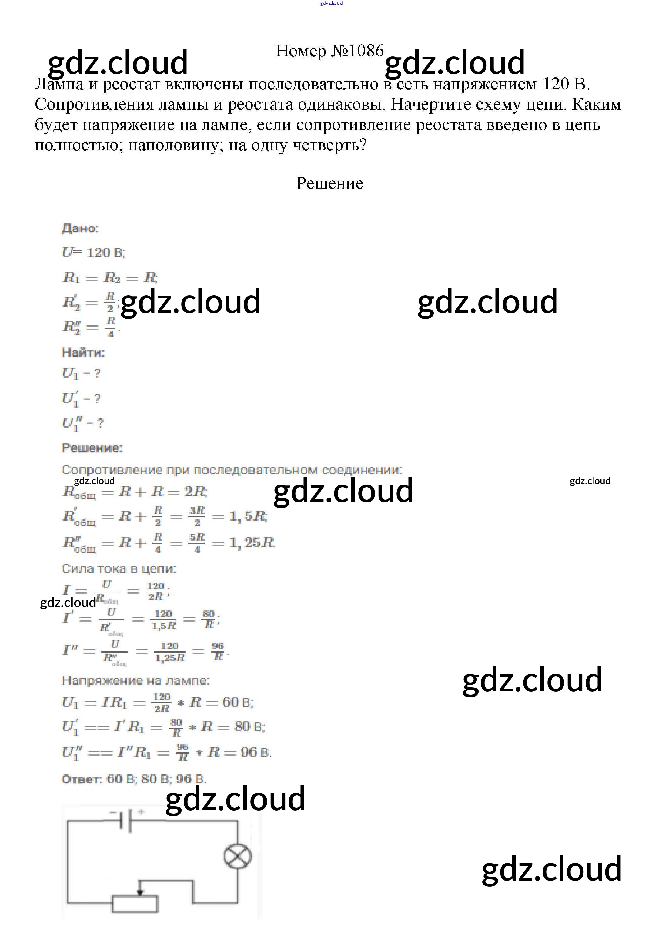 Ответ на задание 1086 Сборник вопросов и задач Физика за 7, 8, 9 (седьмой, восьмой, девятый) класс Марон, Позойский Вертикаль 2013