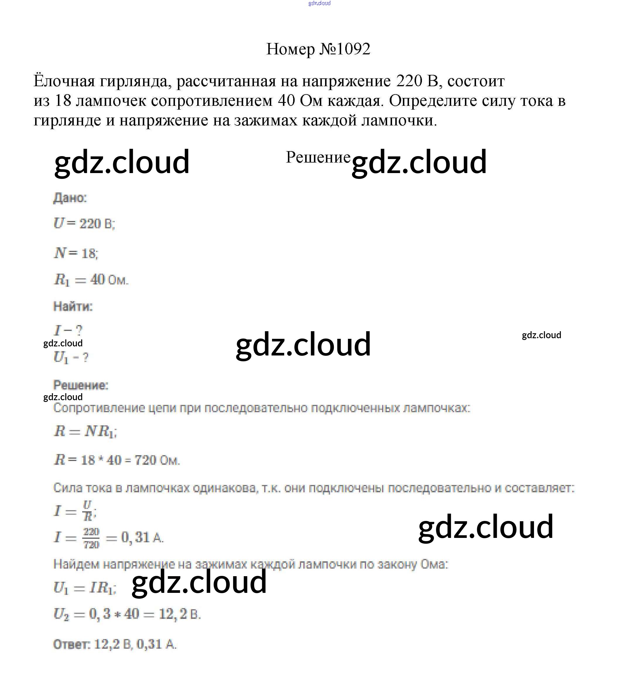 Ответ на задание 1092 Сборник вопросов и задач Физика за 7, 8, 9 (седьмой, восьмой, девятый) класс Марон, Позойский Вертикаль 2013