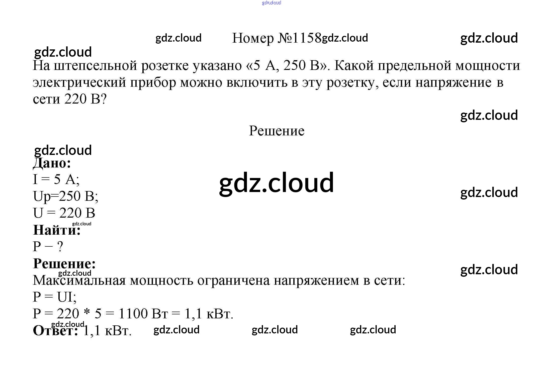 Ответ на задание 1158 Сборник вопросов и задач Физика за 7, 8, 9 (седьмой, восьмой, девятый) класс Марон, Позойский Вертикаль 2013