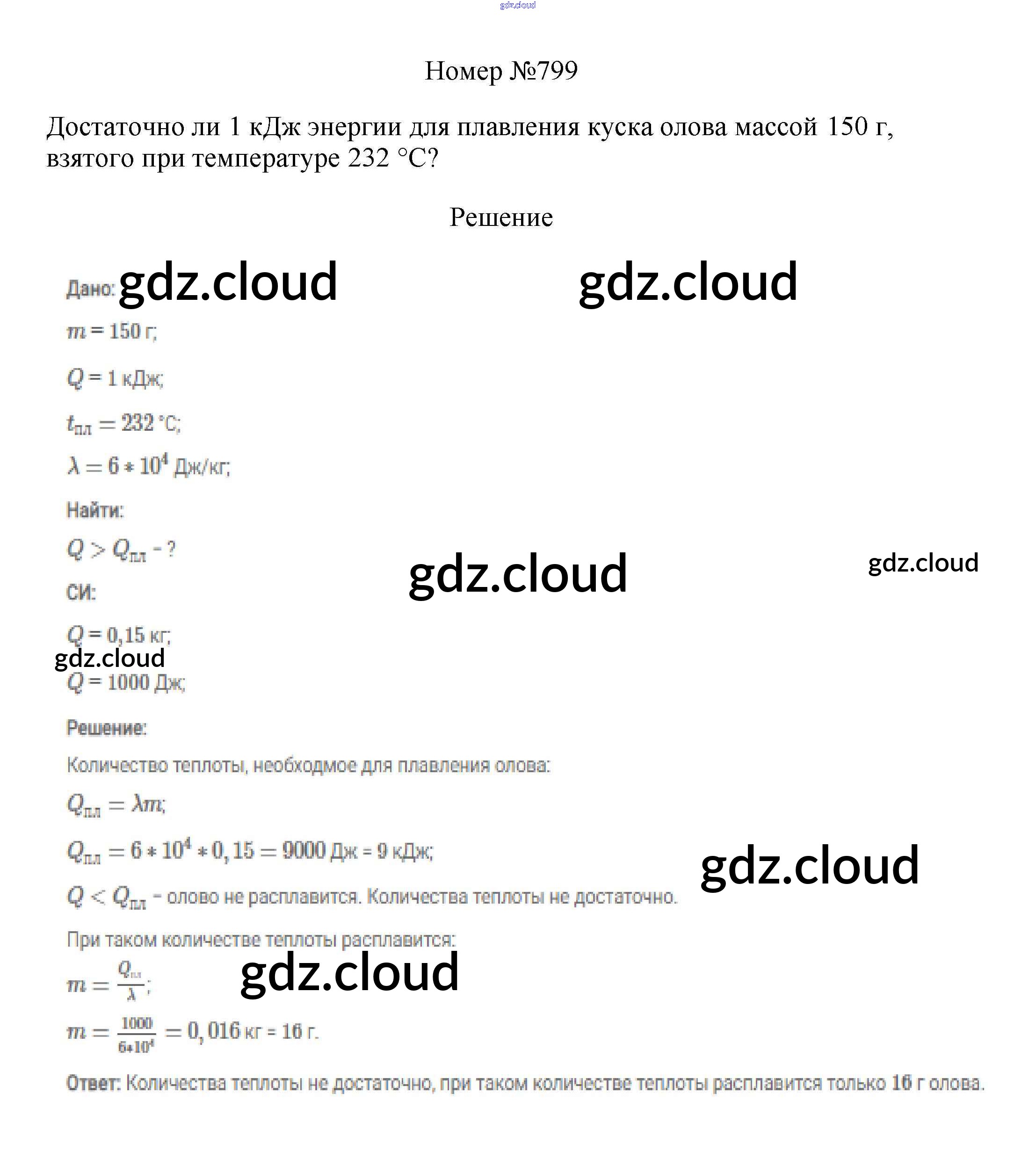Ответ на задание 799 Сборник вопросов и задач Физика за 7, 8, 9 (седьмой, восьмой, девятый) класс Марон, Позойский Вертикаль 2013
