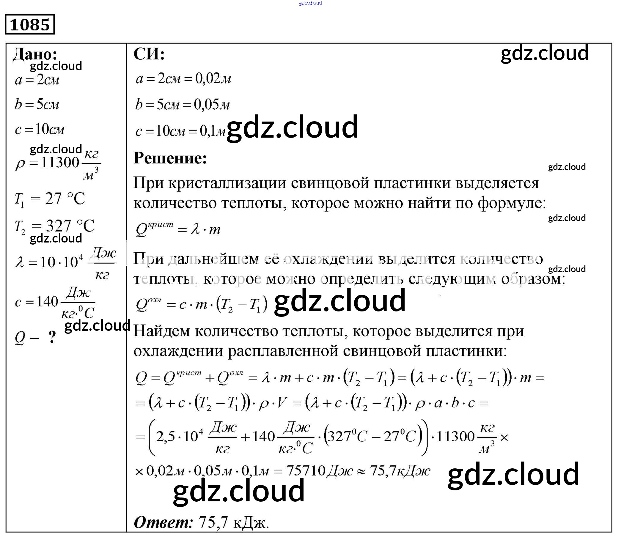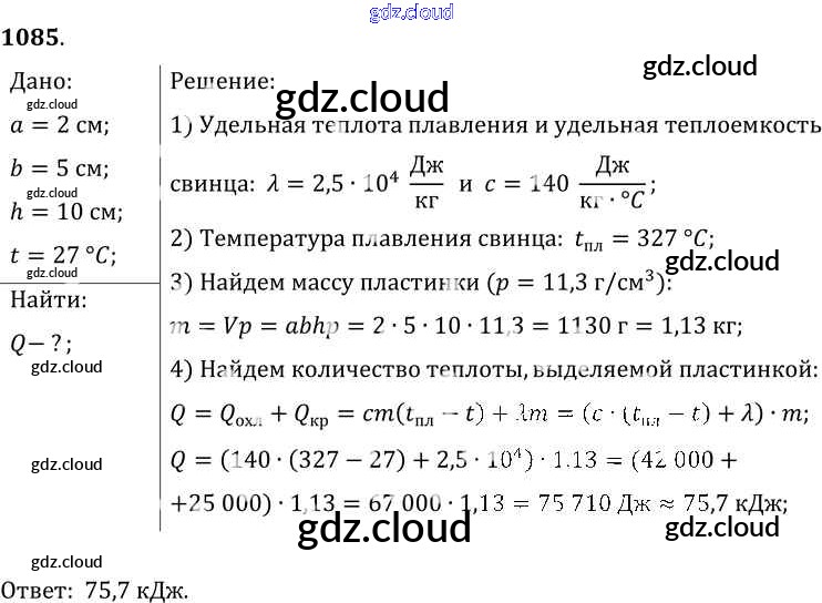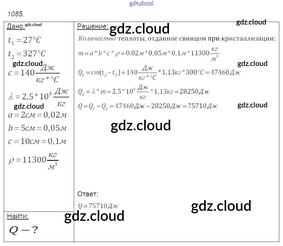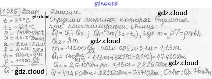 Ответ на задание 1085 Сборник задач Физика за 7, 8, 9 (седьмой, восьмой, девятый) класс Лукашик, Иванова 2011