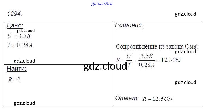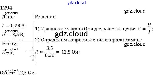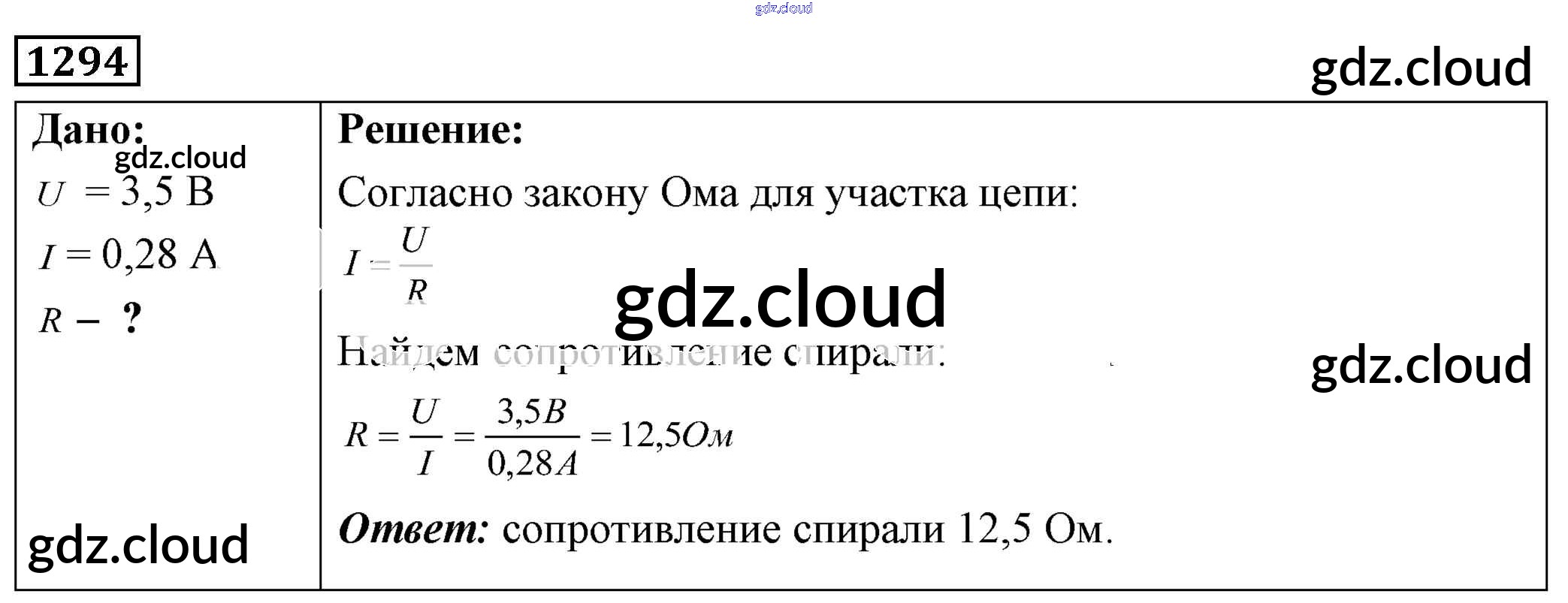 Ответ на задание 1294 Сборник задач Физика за 7, 8, 9 (седьмой, восьмой, девятый) класс Лукашик, Иванова 2011