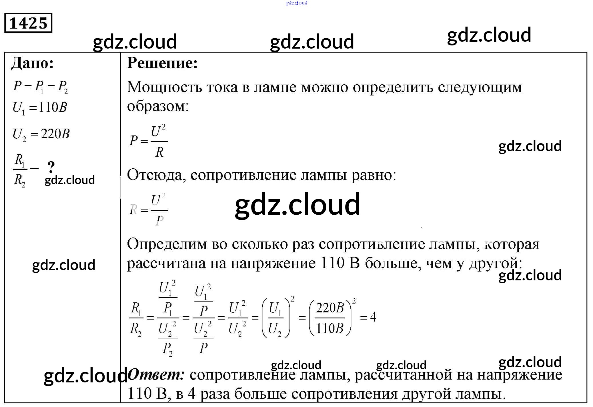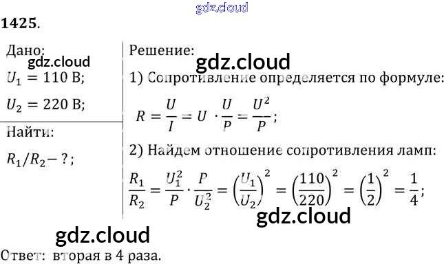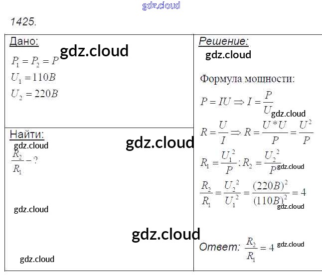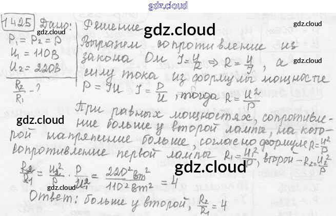 Ответ на задание 1425 Сборник задач Физика за 7, 8, 9 (седьмой, восьмой, девятый) класс Лукашик, Иванова 2011