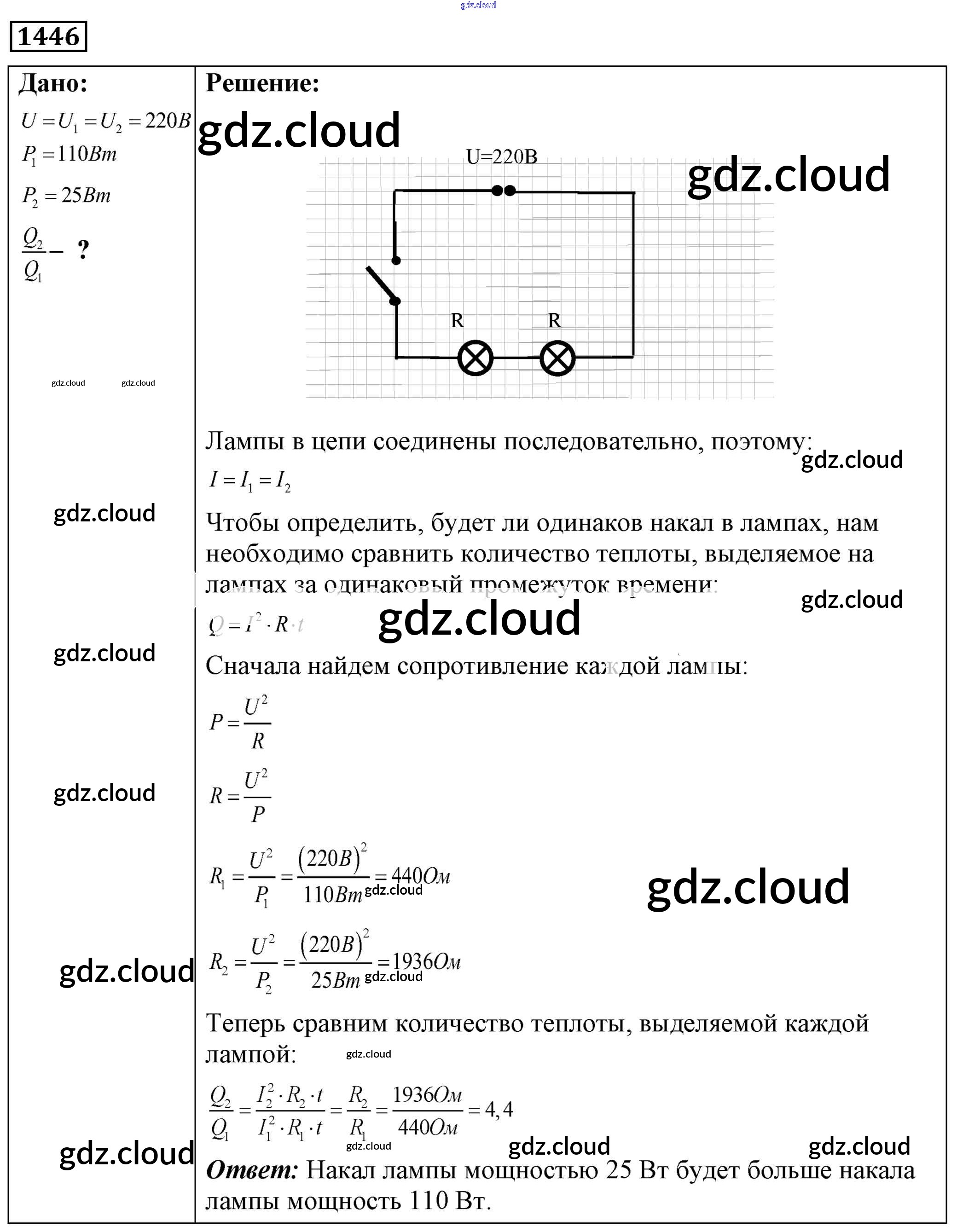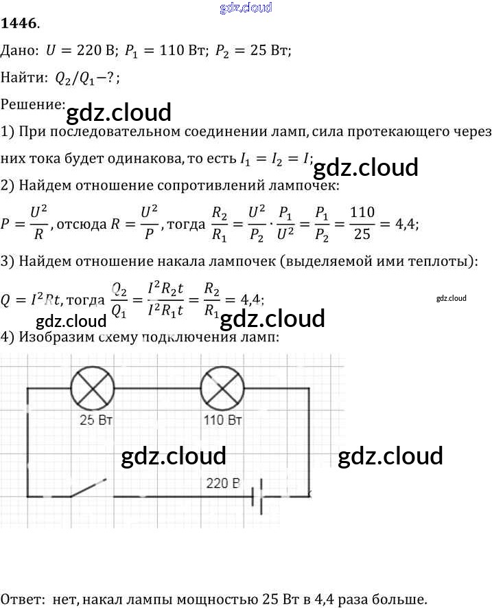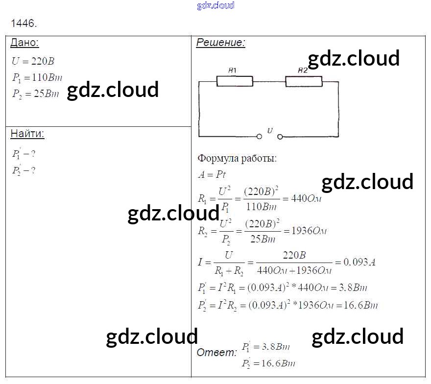 Ответ на задание 1446 Сборник задач Физика за 7, 8, 9 (седьмой, восьмой, девятый) класс Лукашик, Иванова 2011