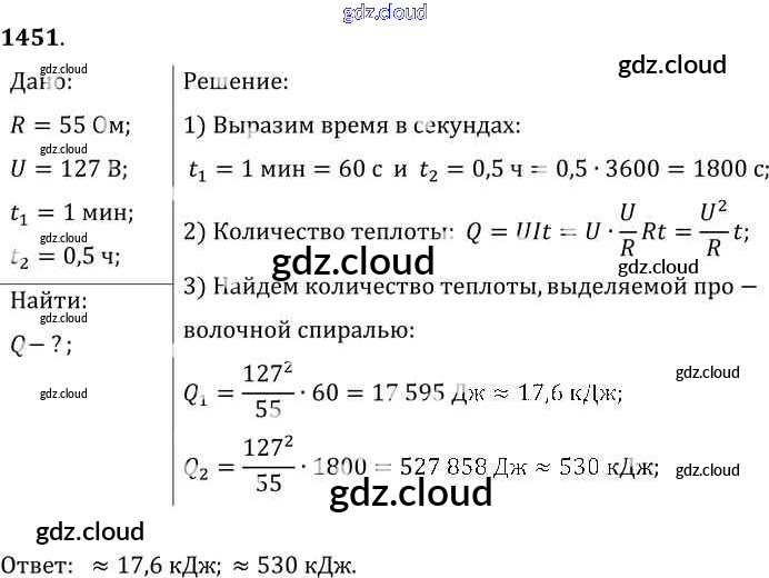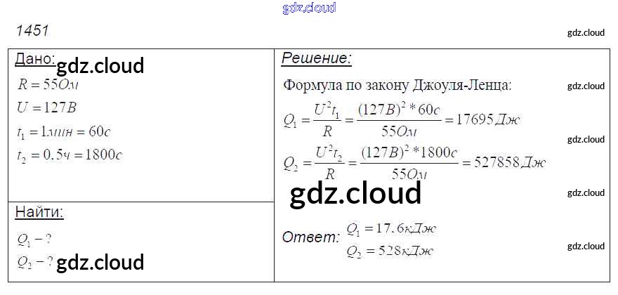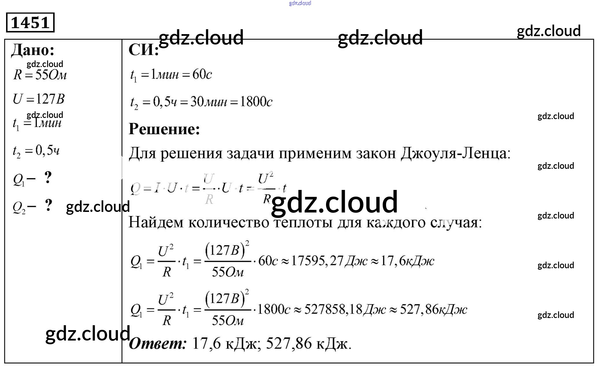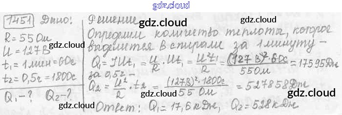Ответ на задание 1451 Сборник задач Физика за 7, 8, 9 (седьмой, восьмой, девятый) класс Лукашик, Иванова 2011