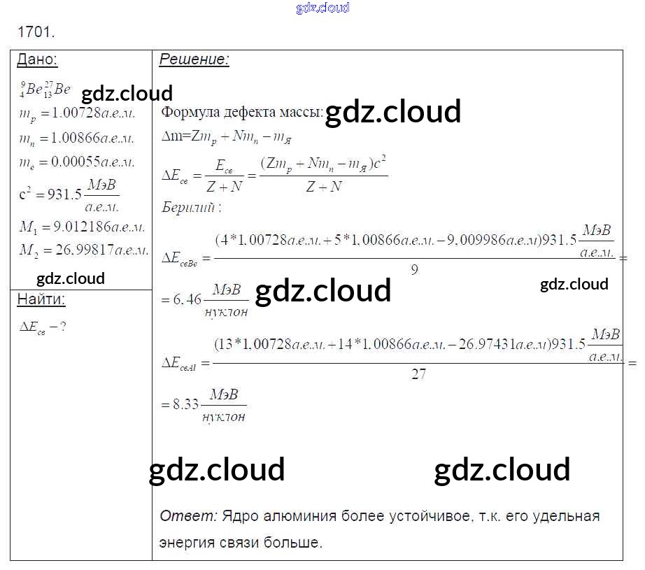 Ответ на задание 1701 Сборник задач Физика за 7, 8, 9 (седьмой, восьмой, девятый) класс Лукашик, Иванова 2011