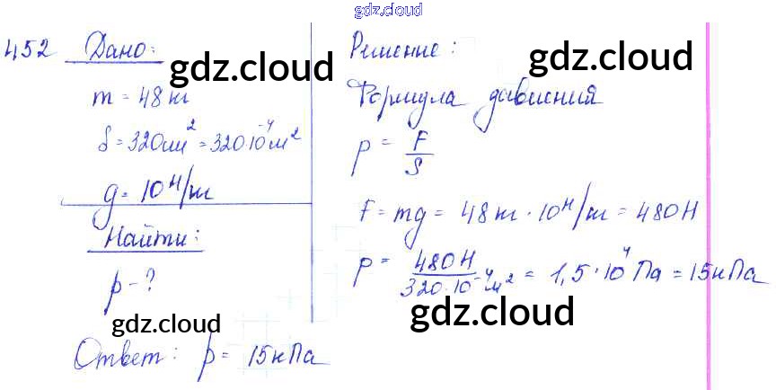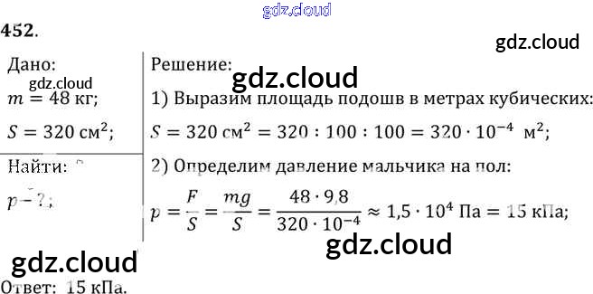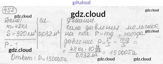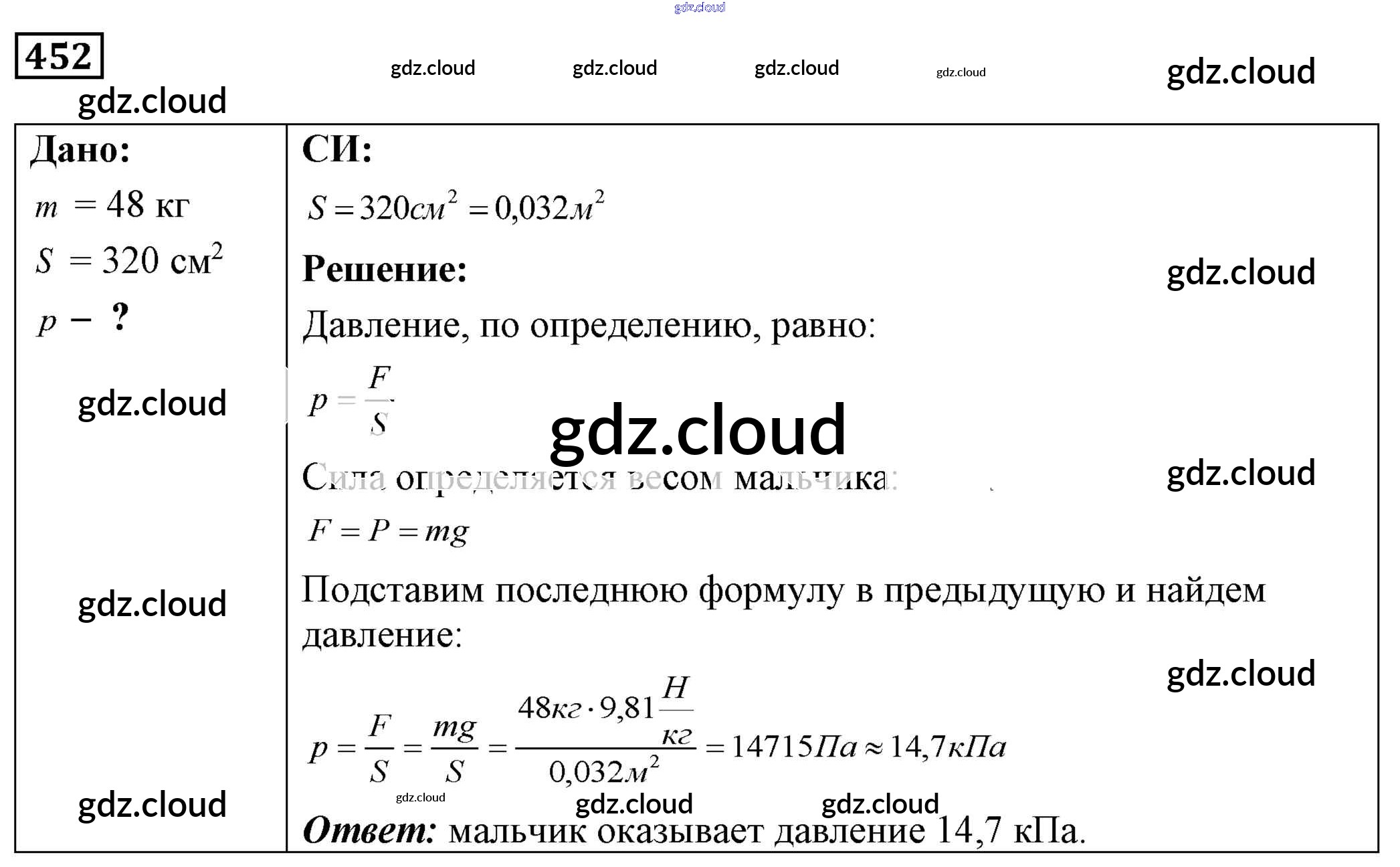 Ответ на задание 452 Сборник задач Физика за 7, 8, 9 (седьмой, восьмой, девятый) класс Лукашик, Иванова 2011