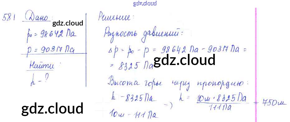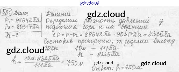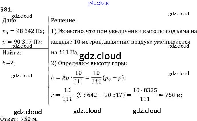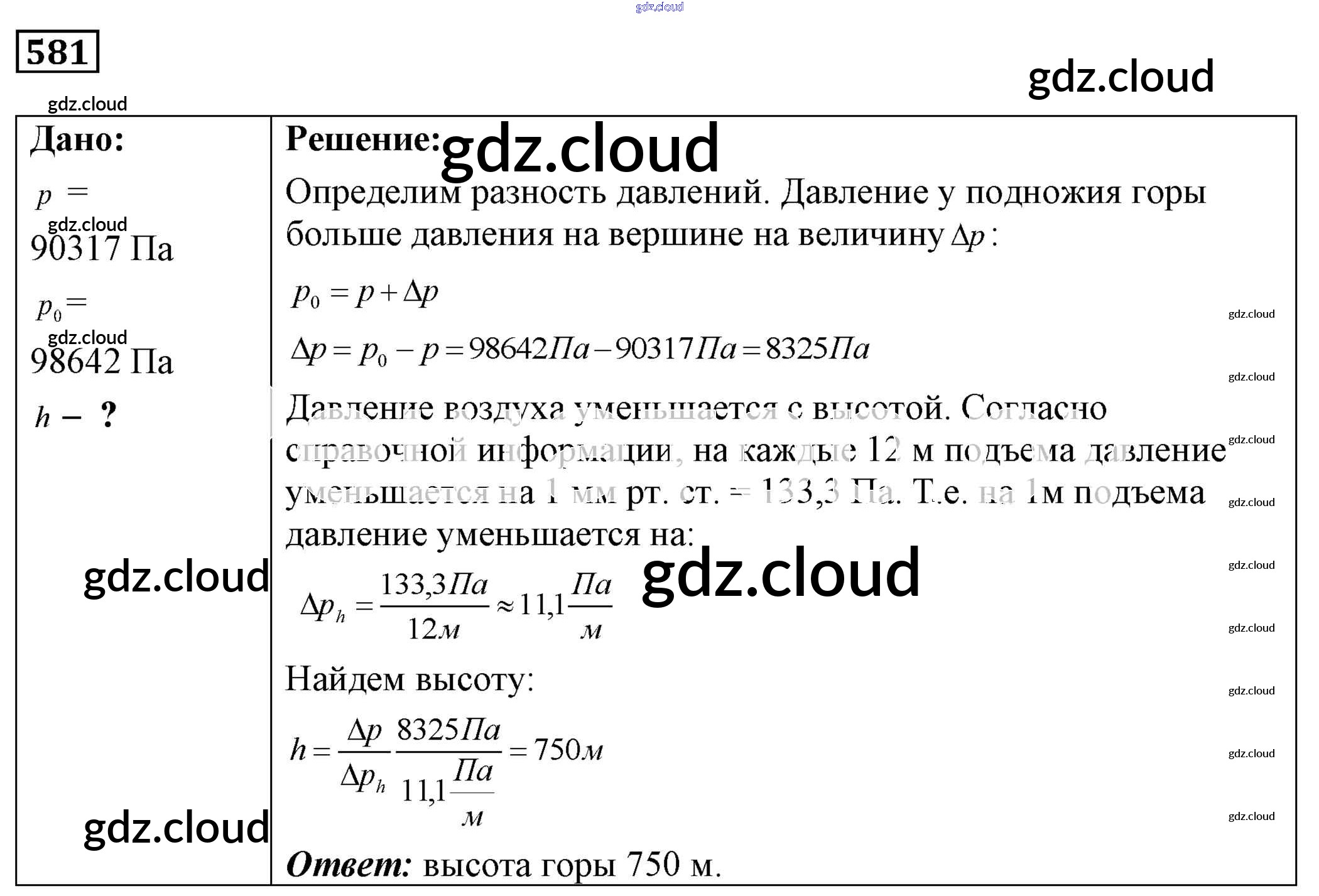 Ответ на задание 581 Сборник задач Физика за 7, 8, 9 (седьмой, восьмой, девятый) класс Лукашик, Иванова 2011