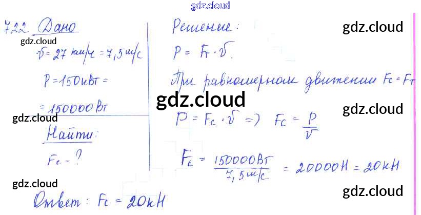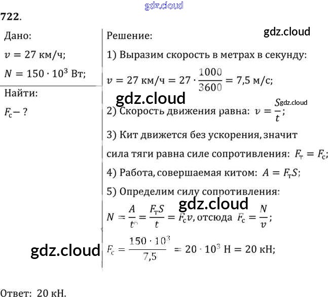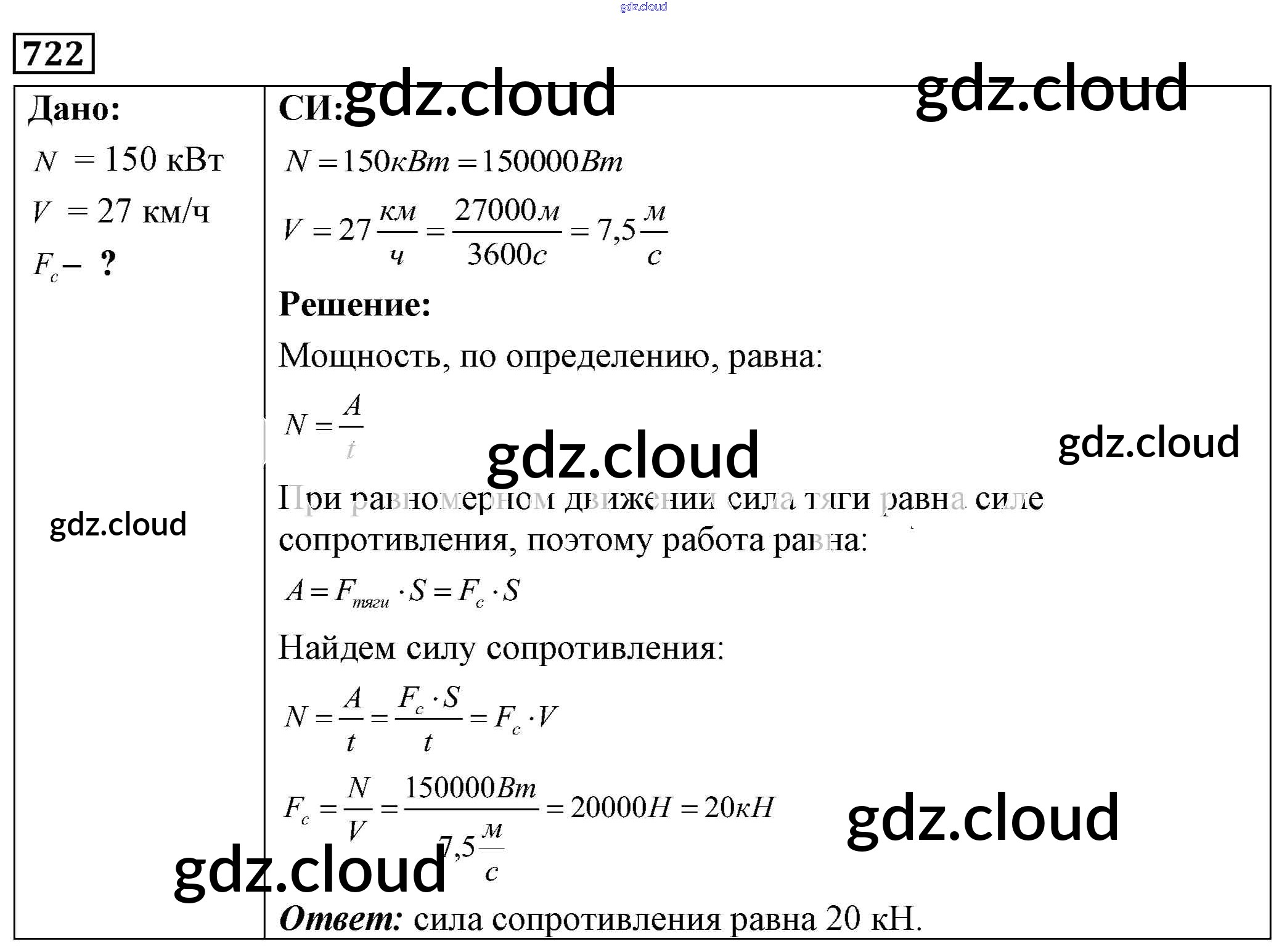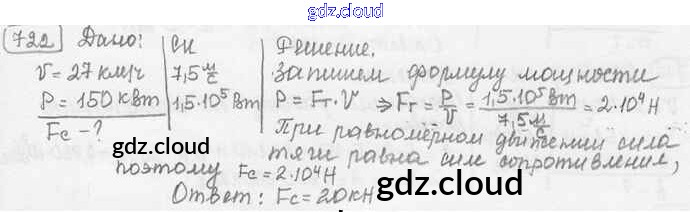 Ответ на задание 722 Сборник задач Физика за 7, 8, 9 (седьмой, восьмой, девятый) класс Лукашик, Иванова 2011