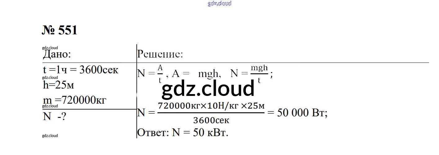 Ответ на задание 551 Сборник задач Физика за 7, 8, 9 (седьмой, восьмой, девятый) класс Перышкин, Лонцова УМК 2016