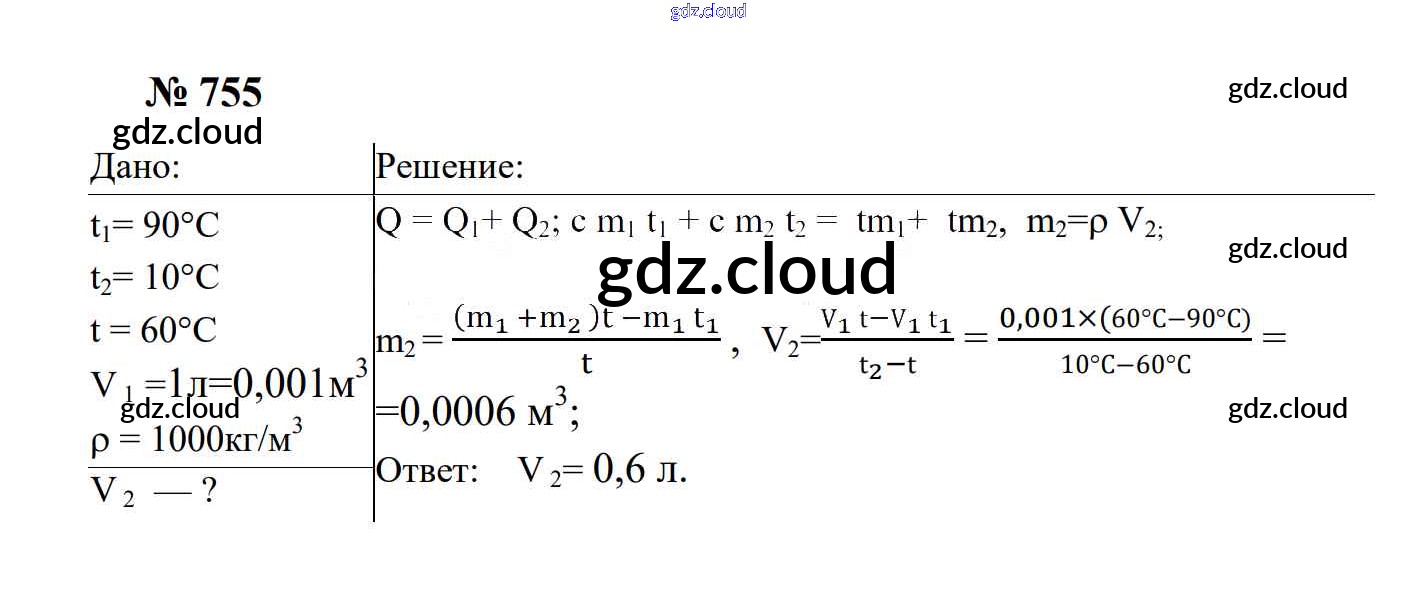 Ответ на задание 755 Сборник задач Физика за 7, 8, 9 (седьмой, восьмой, девятый) класс Перышкин, Лонцова УМК 2016