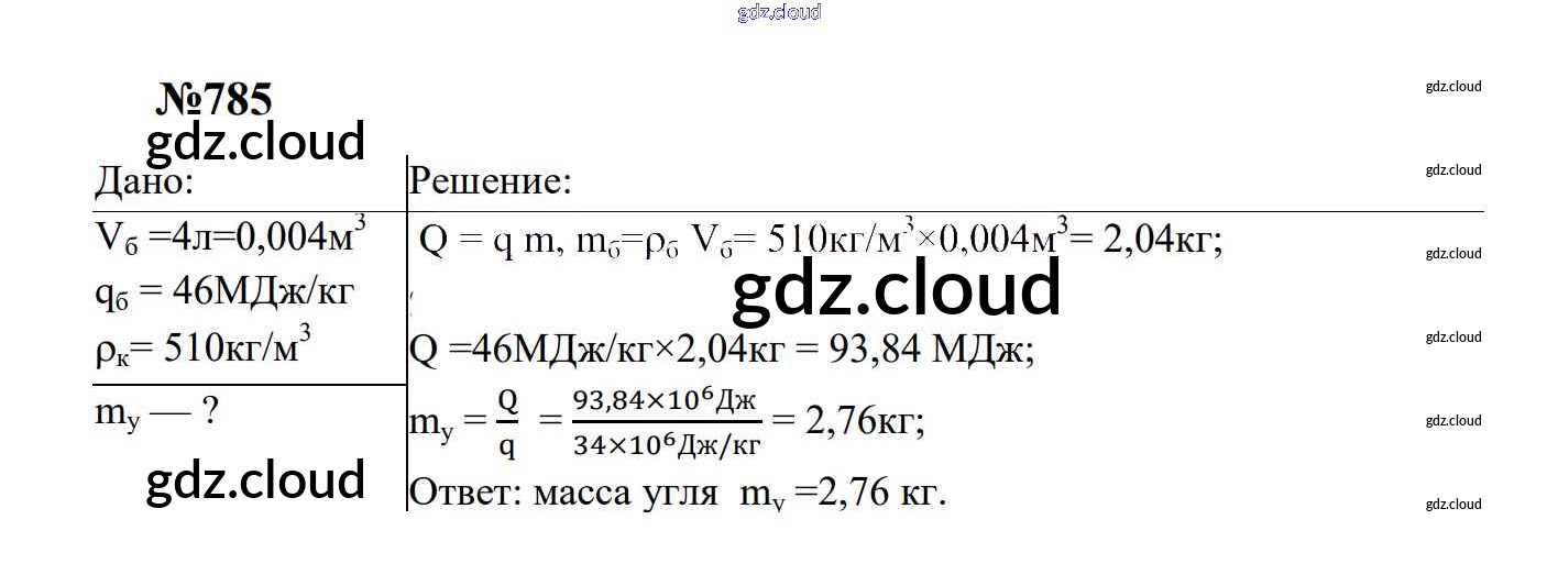 Ответ на задание 785 Сборник задач Физика за 7, 8, 9 (седьмой, восьмой, девятый) класс Перышкин, Лонцова УМК 2016
