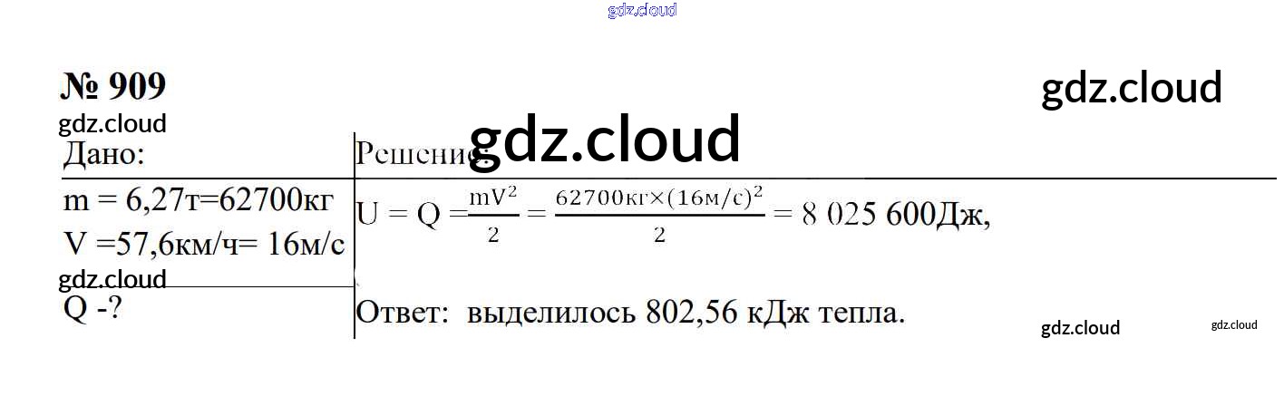 Ответ на задание 909 Сборник задач Физика за 7, 8, 9 (седьмой, восьмой, девятый) класс Перышкин, Лонцова УМК 2016