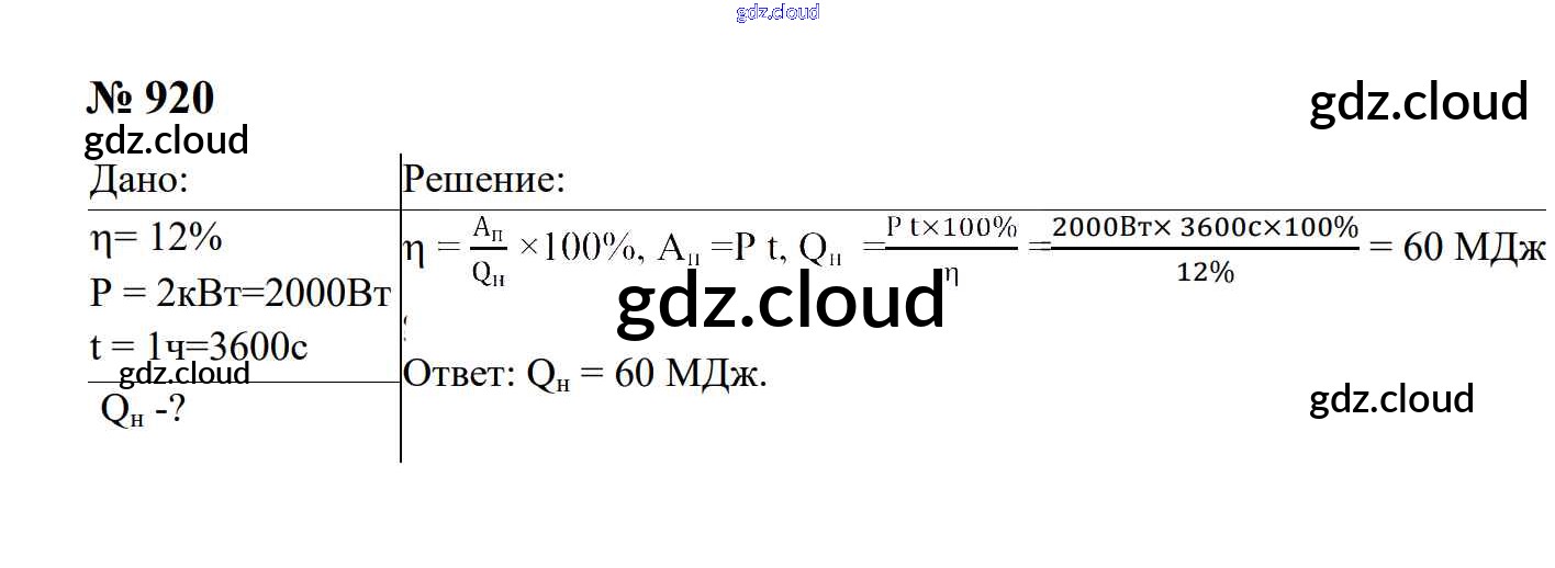Ответ на задание 920 Сборник задач Физика за 7, 8, 9 (седьмой, восьмой, девятый) класс Перышкин, Лонцова УМК 2016