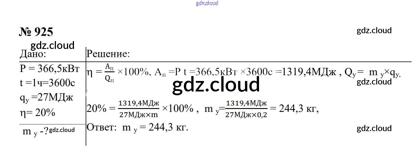 Ответ на задание 925 Сборник задач Физика за 7, 8, 9 (седьмой, восьмой, девятый) класс Перышкин, Лонцова УМК 2016