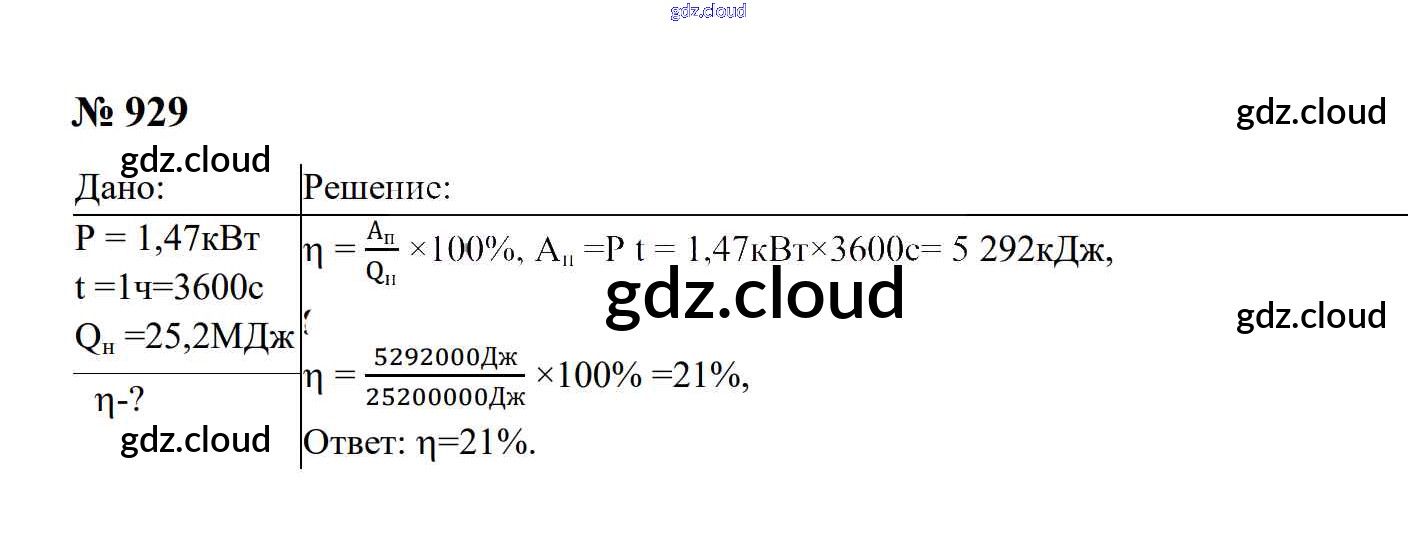 Ответ на задание 929 Сборник задач Физика за 7, 8, 9 (седьмой, восьмой, девятый) класс Перышкин, Лонцова УМК 2016