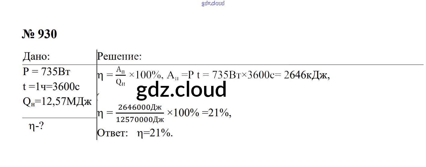 Ответ на задание 930 Сборник задач Физика за 7, 8, 9 (седьмой, восьмой, девятый) класс Перышкин, Лонцова УМК 2016