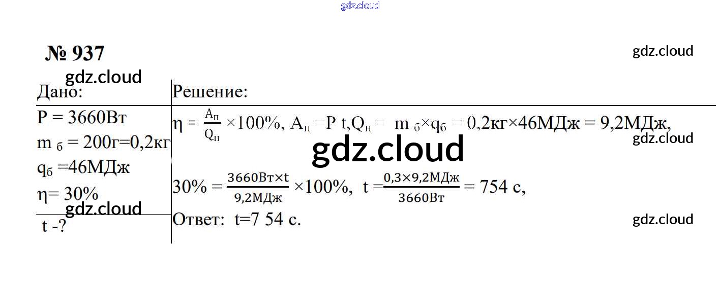 Ответ на задание 937 Сборник задач Физика за 7, 8, 9 (седьмой, восьмой, девятый) класс Перышкин, Лонцова УМК 2016